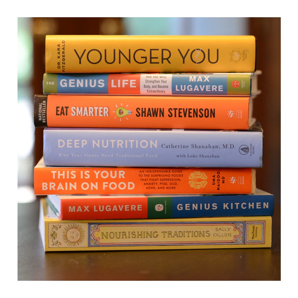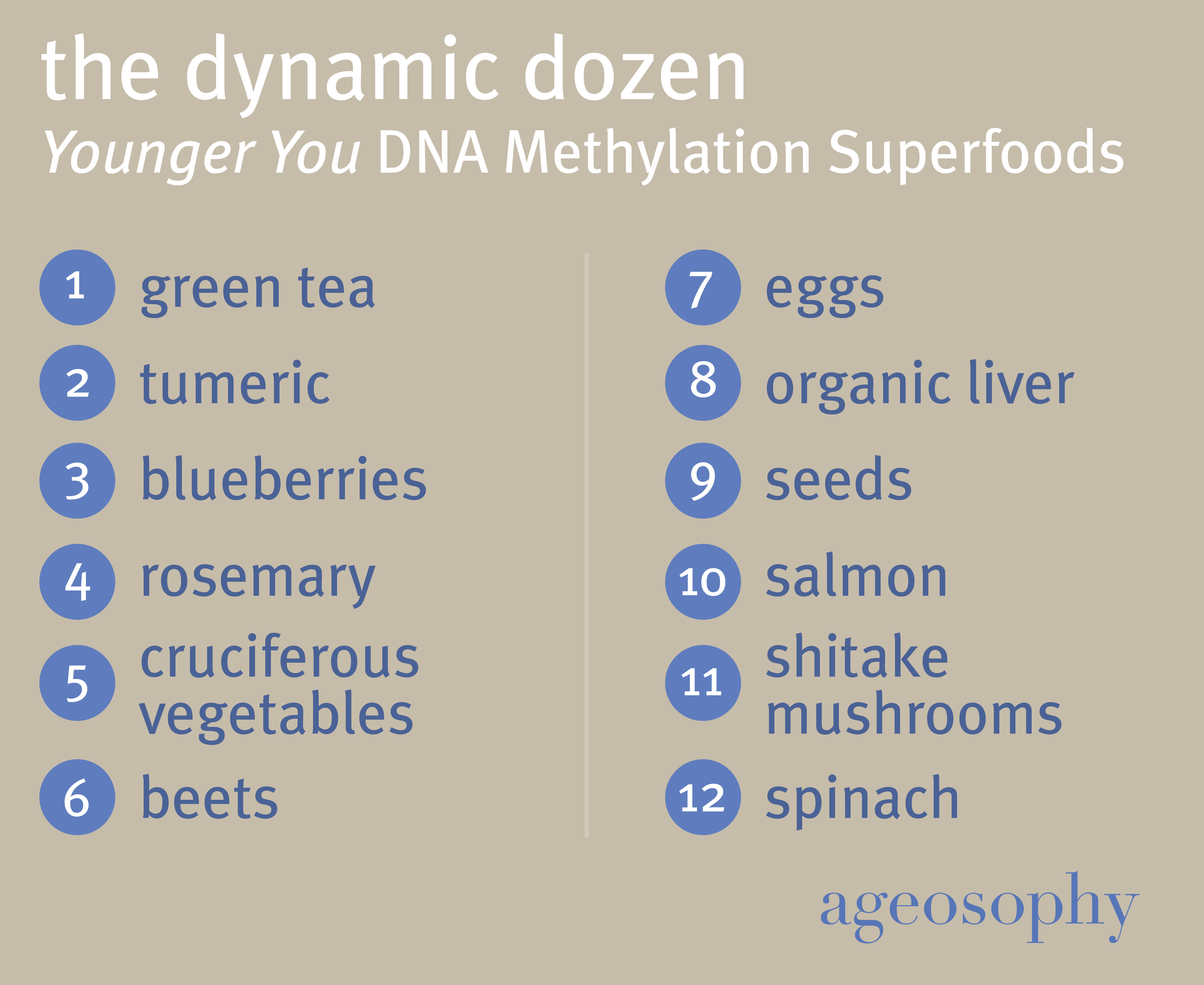 I’ve created my own repertoire of functional foods (which is foundational for aging well) that I like and fits my lifestyle from the aforementioned Deep Nutrition, as well as Eat Smarter by Shawn Stevenson, Genius Life by Max Lugavere and This is Your Brain on Food by Dr. Uma Naidoo. Additionally, I do my level best to include most of Dr. Kara Fitgeragld's “Dynamic Dozen DNA methylation superfoods” from her book Younger You in the chart below (although #8 is definitely not on my list and I’m not a fan of beets, so that’s in supplement form).