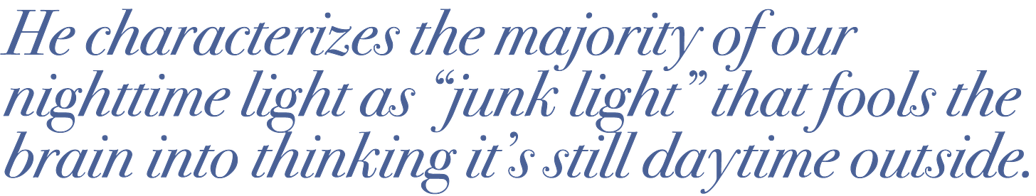 He firmly believes that, in this modern world, “we are a dark-deprived society.” He characterizes the majority of our nighttime light as “junk light” that fools the brain into thinking it’s still daytime outside.