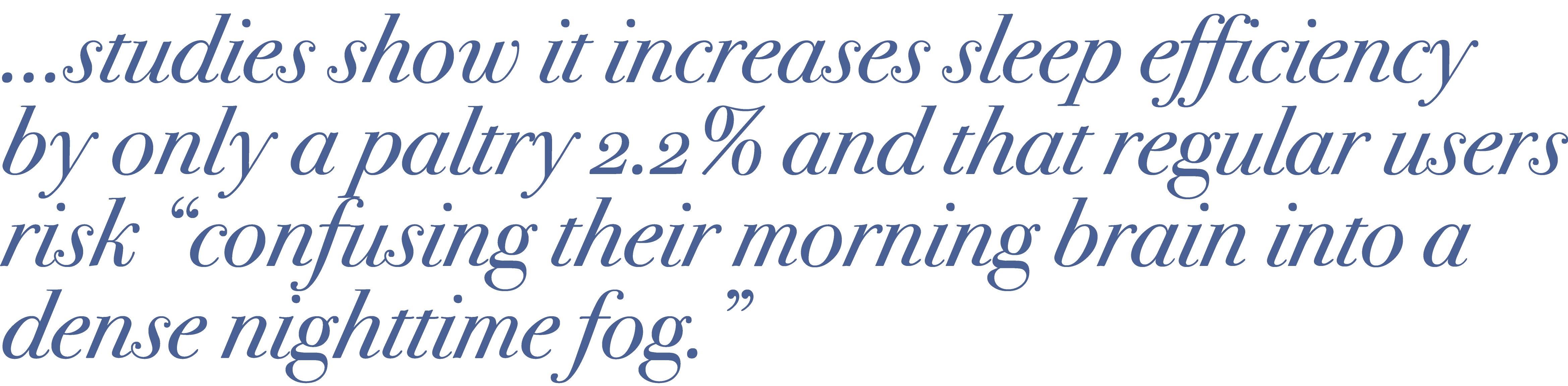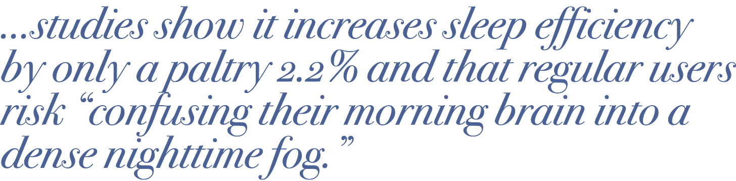 Simplistically, melatonin’s primary role is to regulate our circadian rhythm and tell our body it’s time to sleep. It is a hormone that our body naturally produces, with production rising 1-3 hours before bedtime, peaking at night, and dropping during the day. Dr. Walker’s view is that while melatonin is helpful for jet lag when our bodies are out of their usual rhythm, outside that application, studies show it increases sleep efficiency by only a paltry 2.2% and that regular users risk “confusing their morning brain into a dense nighttime fog.”