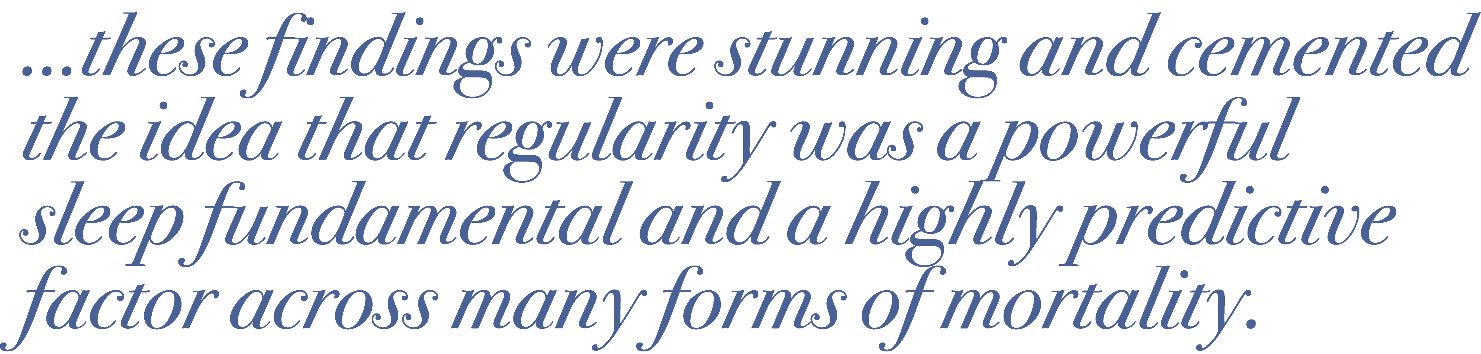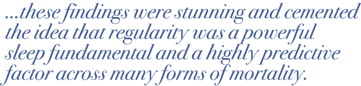 Even for the consummate researcher, these findings were stunning and cemented the idea that regularity was a powerful sleep fundamental and a highly predictive factor across many forms of mortality.