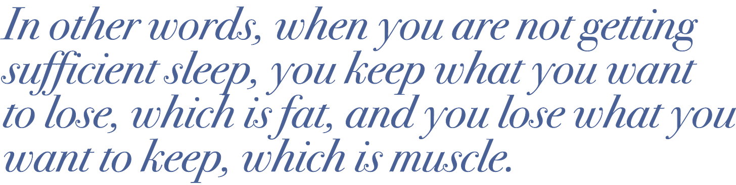 In other words, when you are not getting sufficient sleep, you keep what you want to lose, which is fat, and you lose what you want to keep, which is muscle. Oh. My. Gosh. We need all the muscle mass we can have as we age!