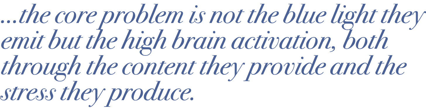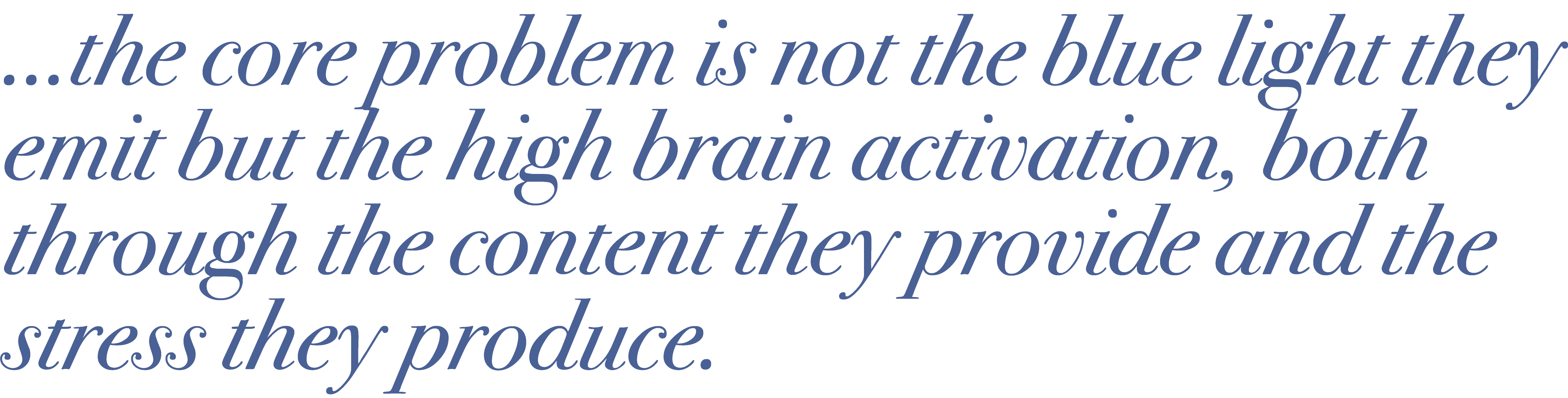 Michael Greta, a relentless Australian researcher, has been trying to replicate the landmark findings without success. He discovered that, with phones and tablets in particular, the core problem is not the blue light they emit but the high brain activation, both through the content they provide and the stress they produce. As Dr. Walker stated, “these devices that we use are attention-capture devices, and they are designed to fleece you of your attention economy. And they do it ruthlessly, spending tens of millions of dollars designing products to do that.”