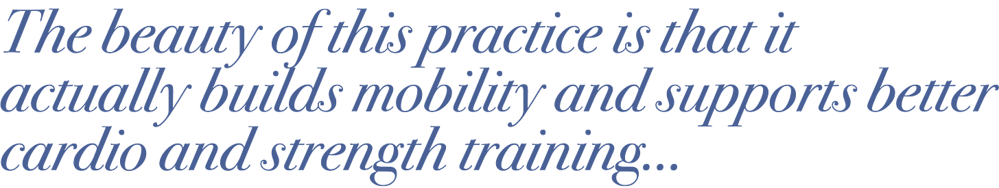 With wisdom gained from nearly three decades of consistent exercise under my belt and confirmed by innumerable studies, I know movement is one of the non-negotiable tenets of a long and productive healthspan. The beauty of this practice is that it actually builds mobility and supports better cardio and strength training by promoting synovial fluid lubrication in the joints, increasing range of motion, and improving balance.