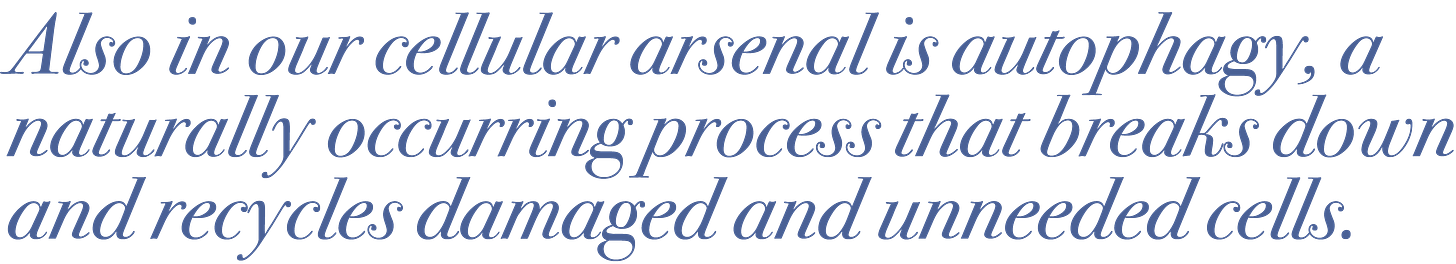Lastly, cellular waste. This caught my attention because I’ve been thinking lately that my focus should be at the cellular level, as our cells power our health. I wrote in “Combatting Zombie Cells” about “zombie” or senescent cells that stop dividing but remain active, releasing inflammatory molecules that harm surrounding cells. Although still in early research stages, there are several natural supplements (quercetin, fisetin, and resveratrol) and pharmaceutical drugs (Apigenin and Rapamycin) known as senolytics that dispatch these deleterious zombie cells.