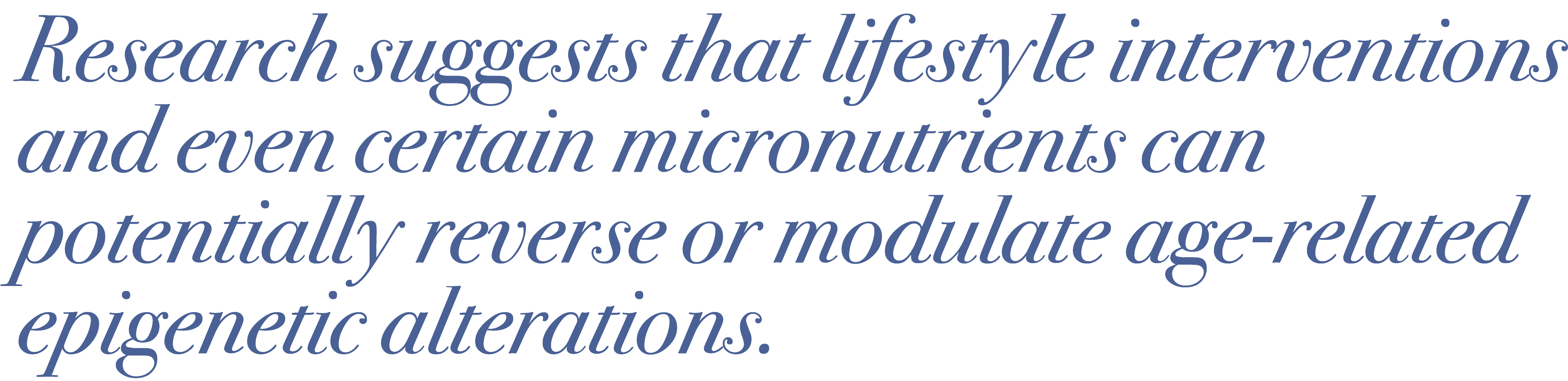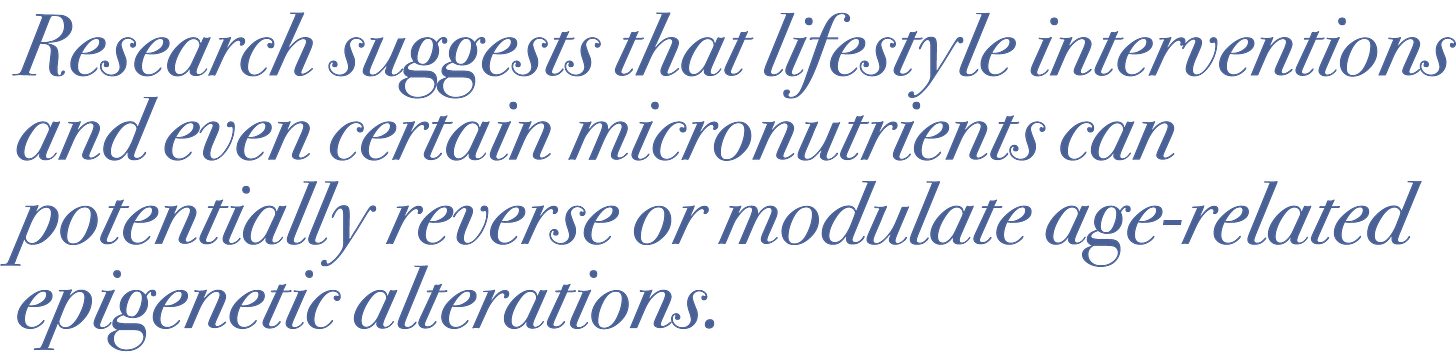 What can we do in the meantime to leverage the same conceptual principles? Epigenetics is an active field of medicine that explores how external factors and behaviors can influence gene expression related to aging. Slower epigenetic age acceleration has been observed in long-lived individuals, suggesting a connection between epigenetic modifications and healthy longevity. Factors like diet, exercise, stress, sleep, and exposure to certain chemicals can all impact epigenomic changes and affect aging rates. Research suggests that lifestyle interventions and even certain micronutrients can potentially reverse or modulate age-related epigenetic alterations.